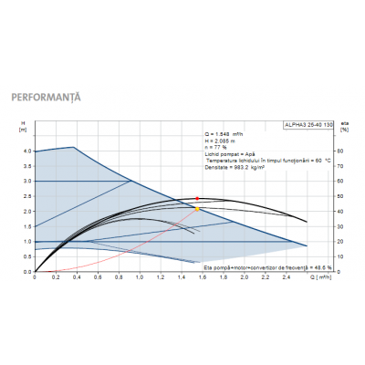 Pompa Grundfos Pompa Grundfos ALPHA3 25-40 130 este proiectată pentru sisteme de încălzire și apă caldă. Este o pompă de tip circulație. Pompa dispune de AUTOADAPT, care ajustează automat pompa la cerințele sistemului pentru confort optim și consum redus de energie, precum și punere în funcțiune simplă. Dispune de conectivitate la dispozitive inteligente prin intermediul aplicațiilor Grundfos.