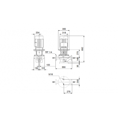 Pompă Grundfos TP 100-250/2 în bavuri, într-o treaptă, cu cuplaj strâns cu racorduri de aspirare şi refulare de diametre identice. Pompele au un design "top-pull-out", adică capul de antrenare (motor, cap pompă şi rotor) poate fi îndepărtat pentru întreţinere sau service în timp ce carcasa pompei rămâne pe conductă. Pompa este echipată cu o etanşare tip pernă de cauciuc neechilibrată. Etanşarea de arbore este conformă cu DIN EN 12756. Racordul conductelor se face prin flanşe PN 16 DIN (EN 1092-2 şi ISO 7005-2). Pompa este echipată cu un motor asincron răcit de un ventilator.